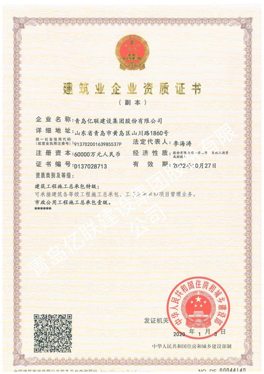 2018年11月,建筑施工板块取得房屋与建筑工程施工总承包特级资质